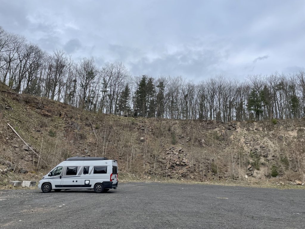 Nach der tschechischen Grenze haben wir „Autobahnen meiden“ ausgewählt, was sich immer bewährt, um zum einen die tolle Landschaft besser zu erleben und zum anderen mehr zu entdecken. Beim Wildgehege Parkplatz angekommen war alles voll. Also sind wir auf einen Parkplatz weiter unten gefahren, der noch in Entstehung war. Hat uns aber überhaupt nicht gestört, denn wir standen alleine und auch für die Nacht sah der Platz gut aus.