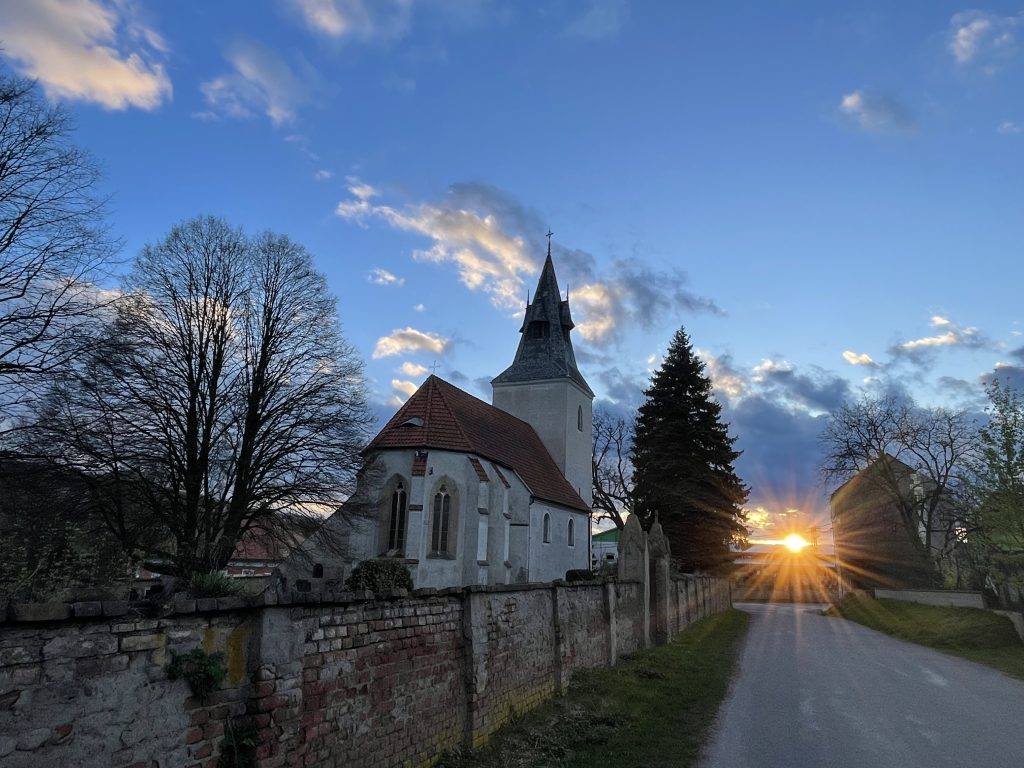 Dann sind wir durch die Innenstadt zurück zu Gustel. Karlsbad ist eine schöne Stadt, die mit vielen alten, bunten Häusern zum Bummeln einlädt. Dann sind wir weitergefahren zu einem Stellplatz an einem See bei Roudniky. An dem Abend hatten wir auch einen tollen Sonnenuntergang. Bei der Kirche war das richtig stimmungsvoll und schön.