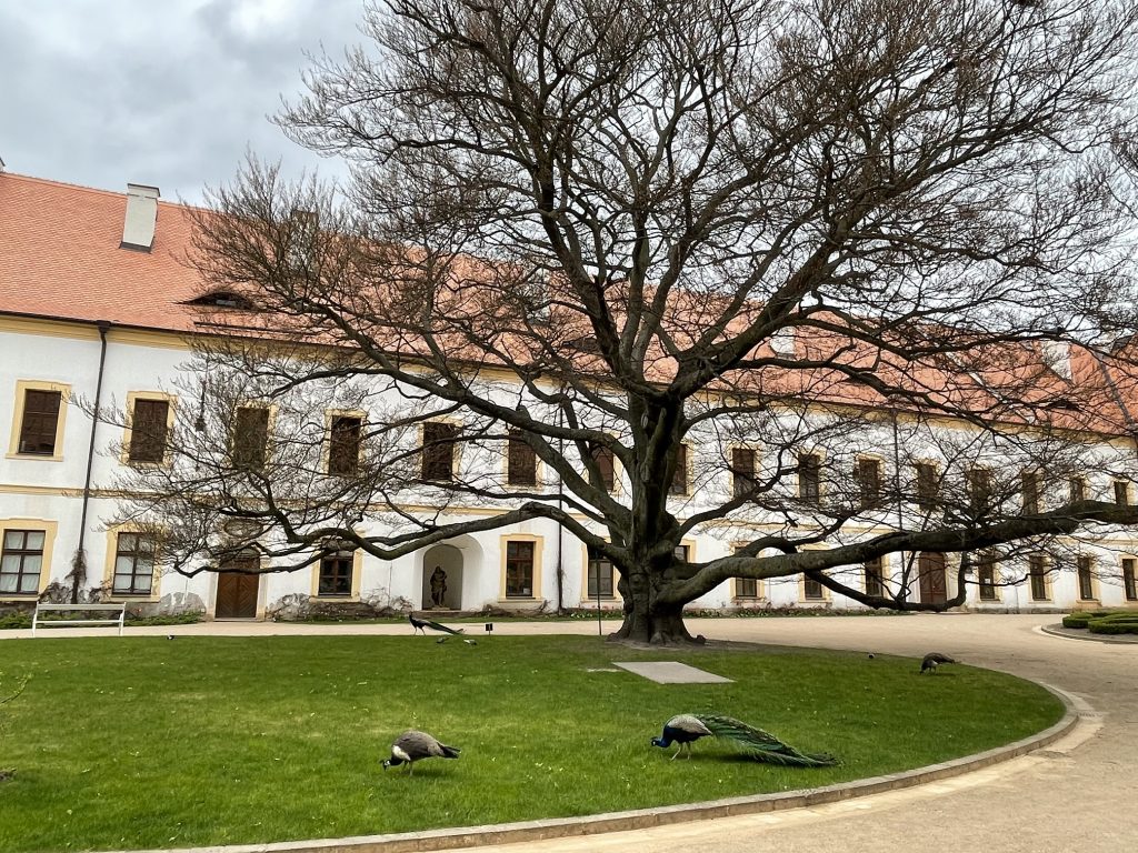 Und so schauen wir erstmal den Pfauen zu, wie sie so selbstverständlich auf dem Schlossgelände herumlaufen und auch ab und zu ein Rad schlagen. Von dem Schlossvorplatz aus hat man auch einen schönen Blick über Decin. Durch den Haupteingang kommt man in den Innenhof, in dessen Zentrum ein schön gewachsener Baum steht. Rundherum gibt es Türen und eine Kirche. Es hatte aber leider alles geschlossen. So sind wir dann durch den angrenzenden Wald und Park wieder zurück zu unserem Gustl. Was für eine schöne Entdeckung dieses Schloss Decin.