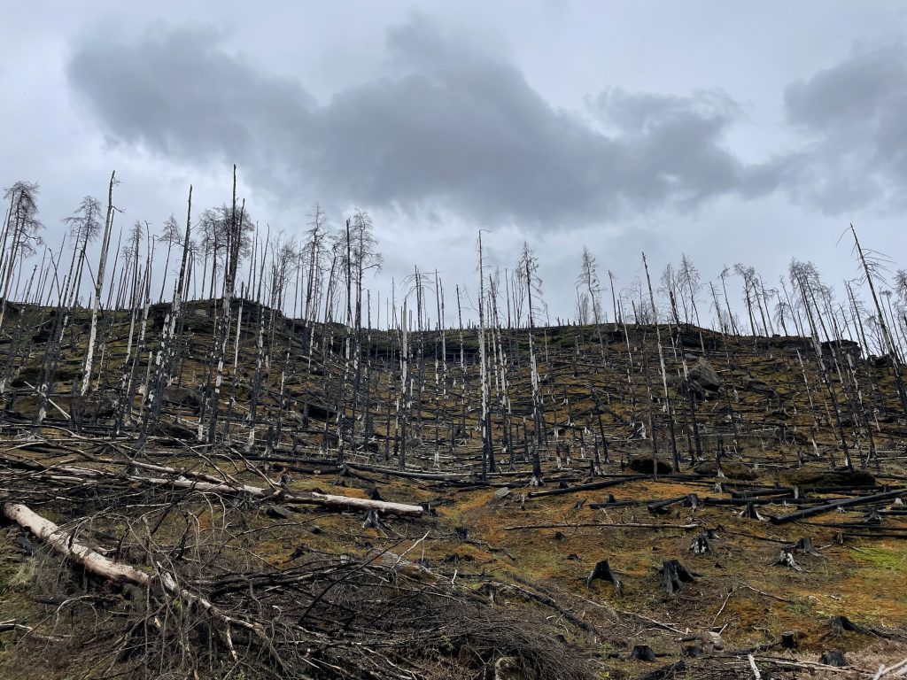 Jetzt aber weiter zum Prebisch Tor. Viele Autos und Souvenierlädchen weisen stark darauf hin, dass die Tour hochfrequentiert sein wird. Tatsächlich hat es sich aber in Grenzen gehalten und die Leute haben sich ganz gut verteilt. Entlang der Straße laufen wir los, bis es nach einiger Zeit ein Weg nach links abgeht. Ringsum unzählige, abgestorbene Fichten. Ein erschütterndes Landschaftsbild. Nicht nur, dass der Borkenkäfer hier einen riesigen Schaden angerichtet hat, auch das Feuer von 2022 hatte hier dann noch zusätzlich leichtes Spiel und großflächig alles niedergebrannt.