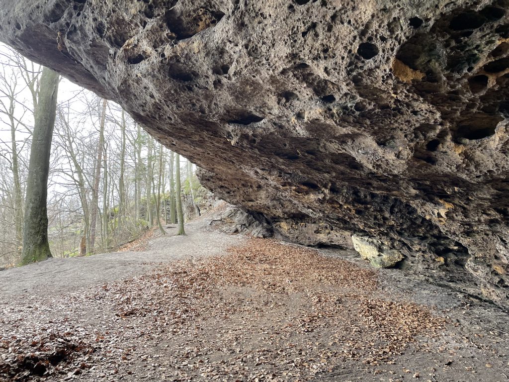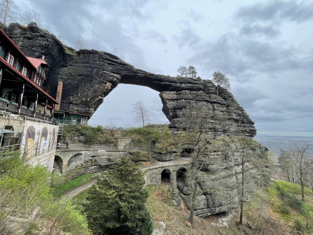 Inmitten dieser zerstörten Bäume ragen hohe, massive Felsformationen empor. Ein bizarres Landschaftsbild begleitet uns bis hoch zum Prebisch Tor. Je höher wir kommen, umso felsiger wird der Weg. Imposante, teils ausgewaschene Felsen mit vielen Löchern. An einem riesigen Felsüberhang sind wir vorbeigekommen, unter dem schon die Bronzezeitmenschen gehaust haben.